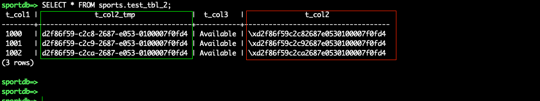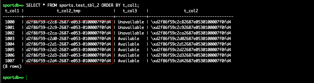 T_COL2_TMP, which stores the converted UUID values from the Oracle source columnsT_COL2: