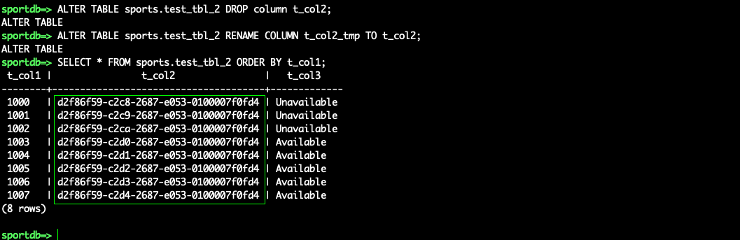 The column T_COL2 is now VARCHAR2 and the values are now in UUID format for migration.