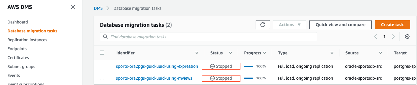 The CloudFormation stack already created the AWS DMS task sports-ora2pgs-guid-uuid-using-expression. AWS DMS supports expressions, which means using SQLite operators or functions to define the data in a column. In rule-id 2, we use the SQLite substring (SUBSTR), hexadecimal function (HEX), and lowercase (LOWER) functions to break the GUID data into several groups separated by hyphens, specifically a group of 8 digits followed by three groups of 4 digits followed by a group of 12 digits, for a total of 32 digits representing the 128 bits.
