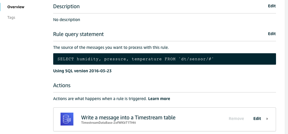 You can edit the rule configuration for writing data to the Timestream table by choosing Edit.