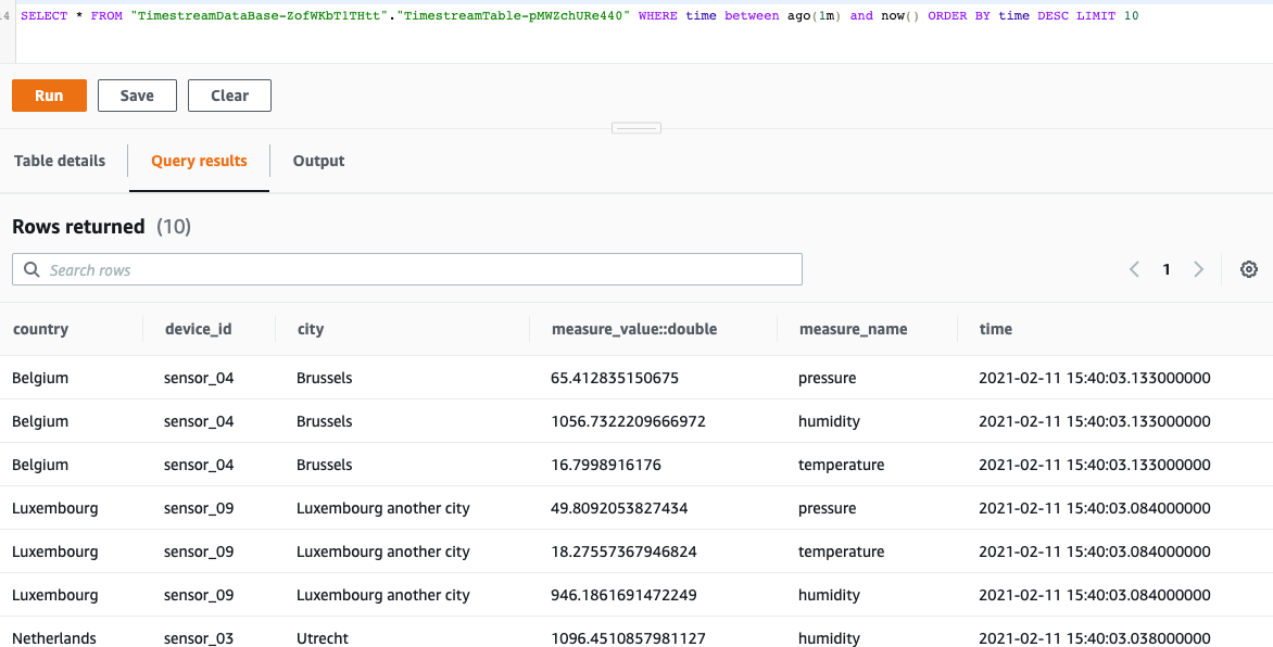 The following screenshot shows that the Timestream table is populated with the data coming from the AWS IoT Core sensor data script.