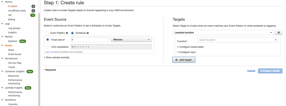 Let’s create a Lambda function that runs every 5 minutes to check for sensor readings in the Timestream database. To schedule the Lambda function, you can create a CloudWatch Events rule and define either a fixed time interval or a cron job. Then choose your desired function as the target.