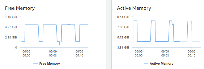 With Amazon RDS Enhanced Monitoring, we can monitor the memory usage. In the following graphs, we can see active memory used by the query and at the same time, drop in free memory was also observed. I reran the same query multiple times to show the consistency and accuracy of Enhanced Monitoring metrics.