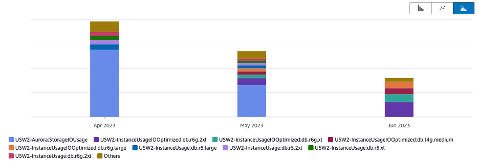 The graphs below are indicative of the realized benefits in terms of the cost savings that Open Raven noted in their RDS/Aurora telemetry graphs: The first and second graphs show the overall Aurora Spend in the Months from April to June. Both graphs show that there were IOPs spend in April and May with in dark blue and light blue respectively. Open Raven made the move to Aurora I/O optimized in the middle of May and the graphs depict that the I/O spend had decreased from the previous month. For the month of June, there is no longer any spend on I/O and the overall cost decreased month over month. The third graph is their overall AWS spend over a one year period with a decrease in overall spend once I/O optimized was implemented.