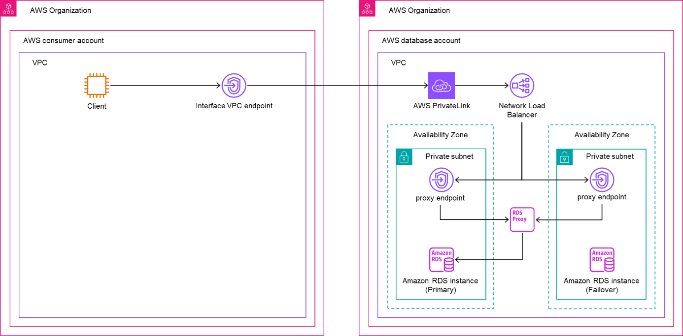 In this post, we show how the organization created a solution for highly available, centralized database access. They achieved this by combining Amazon RDS Proxy with AWS PrivateLink, which allows for secure and private access to RDS databases. This solution enables clients from different AWS Organizations and accounts to connect to the database over PrivateLink, even if they have overlapping CIDR ranges.