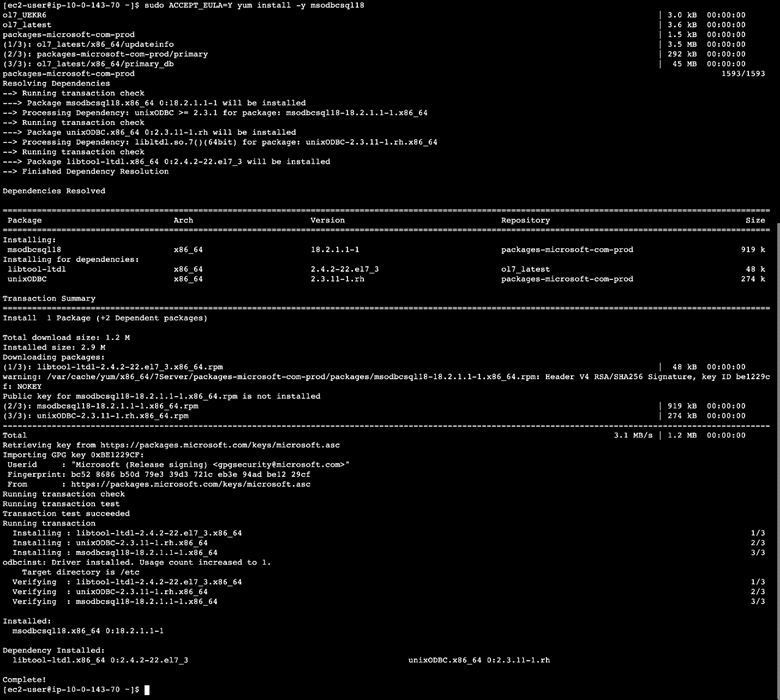 - Install the ODBC Driver for SQL server version 18, automatically accepting the End-User License Agreement (EULA) to proceed with the installation. It is important to ensure that you install the correct version that matches your specific database and operating system requirements.
