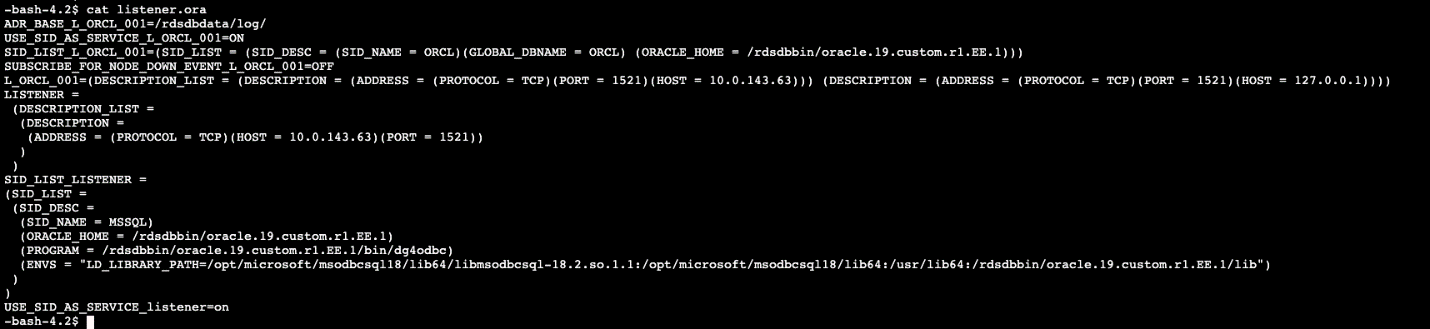 $ORACLE_HOME/hs/admindirectory on the RDS Custom for Oracle database. This directory, located within theORACLE_HOME, contains essential files and configurations related to the Oracle Heterogeneous Service. It enables the seamless operation of Oracle with various heterogeneous database engines. For detailed guidance, consult the Database Heterogeneous Connectivity User’s Guide. - Create a file called