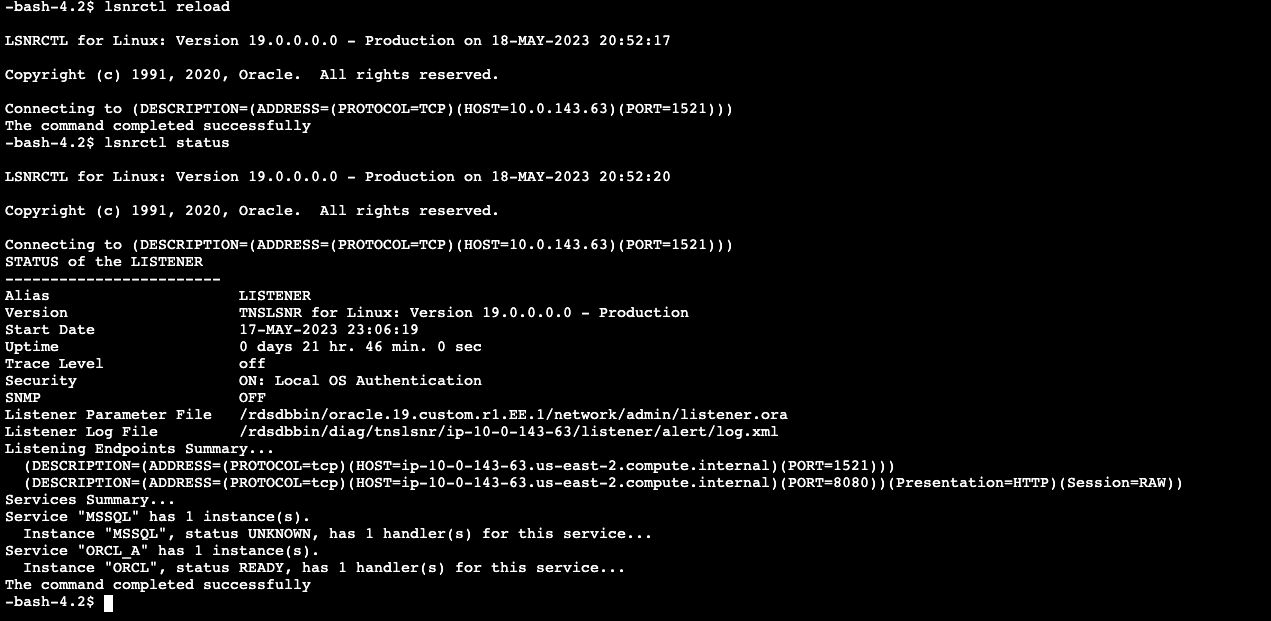 - To apply the changes made to the listener configuration, you need to reload the listener. Use the following commands to reload the listener and check its status.