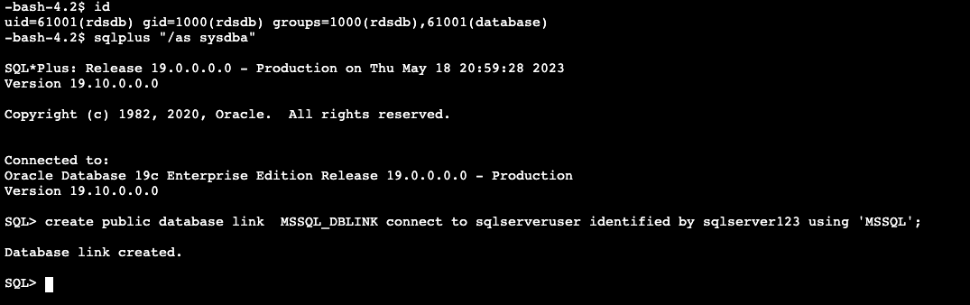 - Create a database link in the Oracle database on Amazon RDS Custom for Oracle to connect to the MSSQL database using the configured ODBC settings.