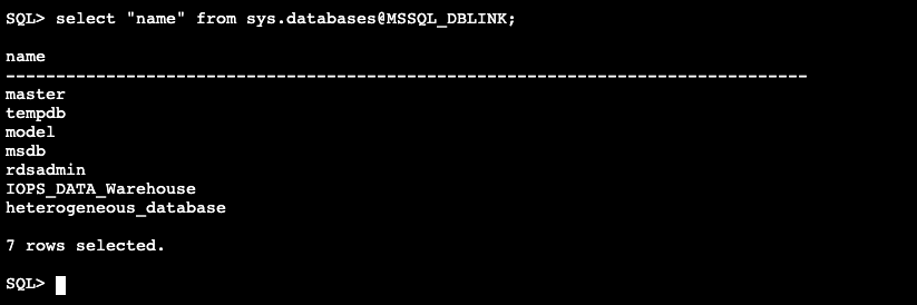 Now that we have created the database link, let’s retrieve date from the SQL Server Dynamic Management Views, such as sys.databases. It is important to enclose the SQL Server objects in double quotation marks for successful execution.