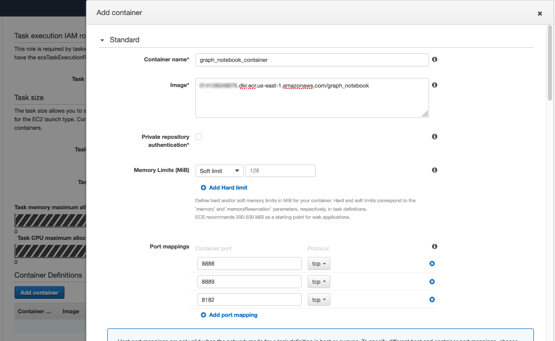 graph_notebook_container. - For Image, enter the repository URI that we created in the previous step. It’s in the format