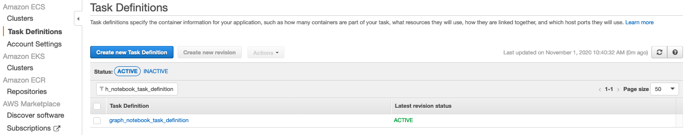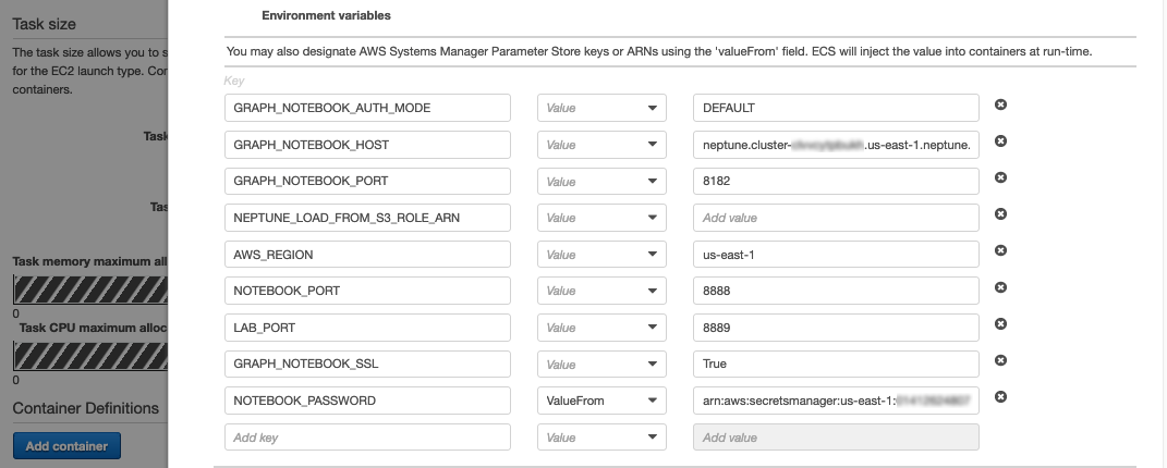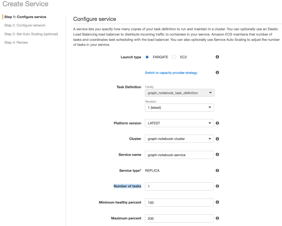 graph-notebook-service. - Enter suitable value for Number of tasks. For this walkthrough, we use one task.