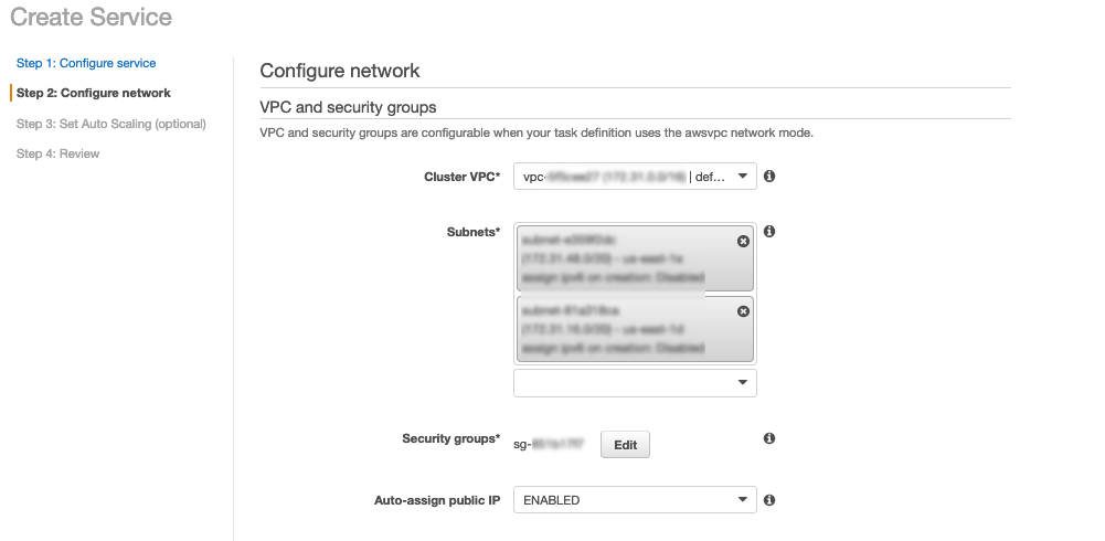 You may wish to change these options depending on your requirements. For more information, refer to Creating an Amazon ECS service.