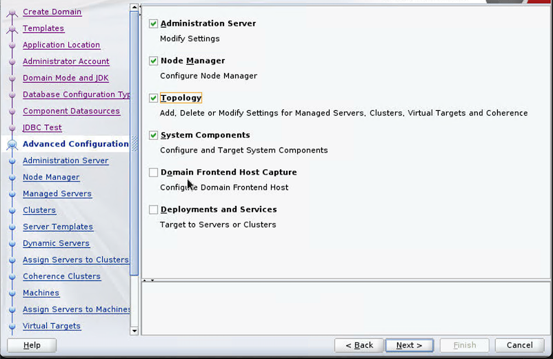 - On the Advanced Configuration page, select Administration Server, Node Manager, Topology, and System Components, then choose Next.