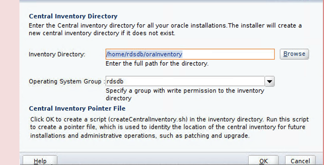 /home/rdsdb/oraInventory, and OS Group to dba, then choose OK.