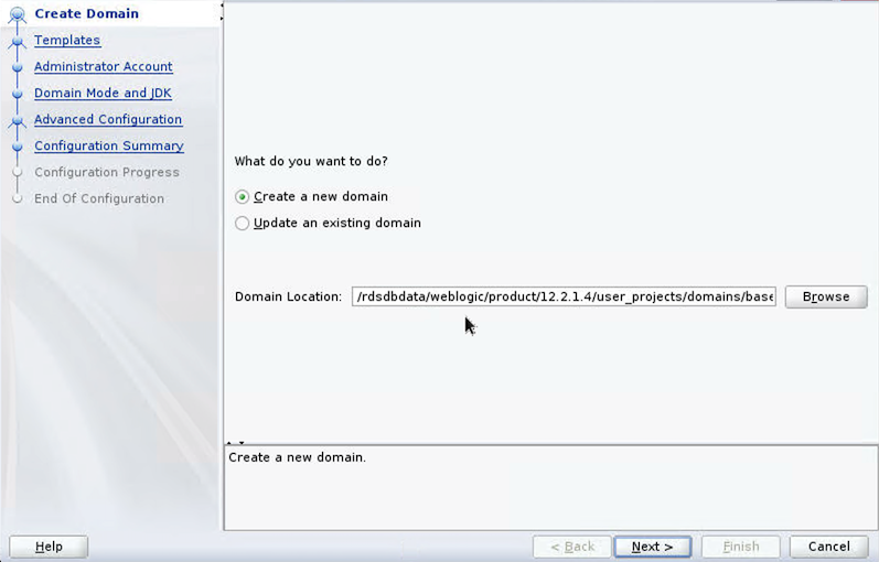config.shfile located inORACLE_HOME/oracle_common/common/bin. - Choose Create a new domain and enter the desired domain home path (for this post, we use