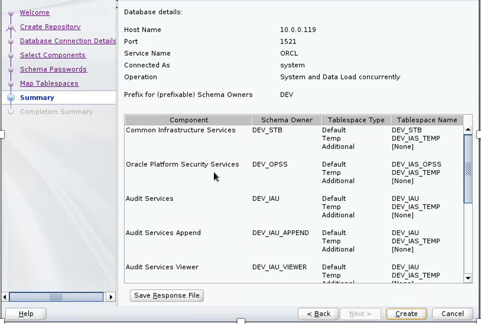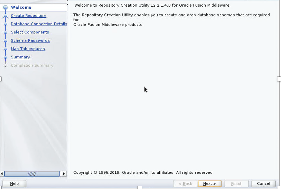 RCU is available with the Oracle Fusion Middleware Infrastructure distribution. After you install Oracle Fusion Middleware Infrastructure and create your Oracle Home, you can start RCU from $ORACLE_HOME/oracle_common/bin. The RCU creation log file is typically stored in the tmp directory as /tmp/RCU<Timestamp>/logs/rcu.log. Complete the following steps to create your database schema: