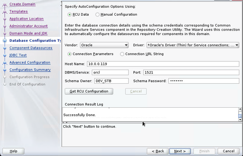 - On the Database Configuration Type page, provide the RCU DB connection information that was created in the earlier step, then choose Get RCU Configuration.