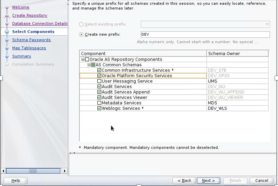 Refer to Document ID Invalid Username/Password Error While Running The RCU Utility (Doc ID 2318543.1) if you get errors likeORA 28040 - No matching authentication protocol. - On the Select components page, select Prefix, provide a name (we use DEV) for the database schemas, and select the following components:
