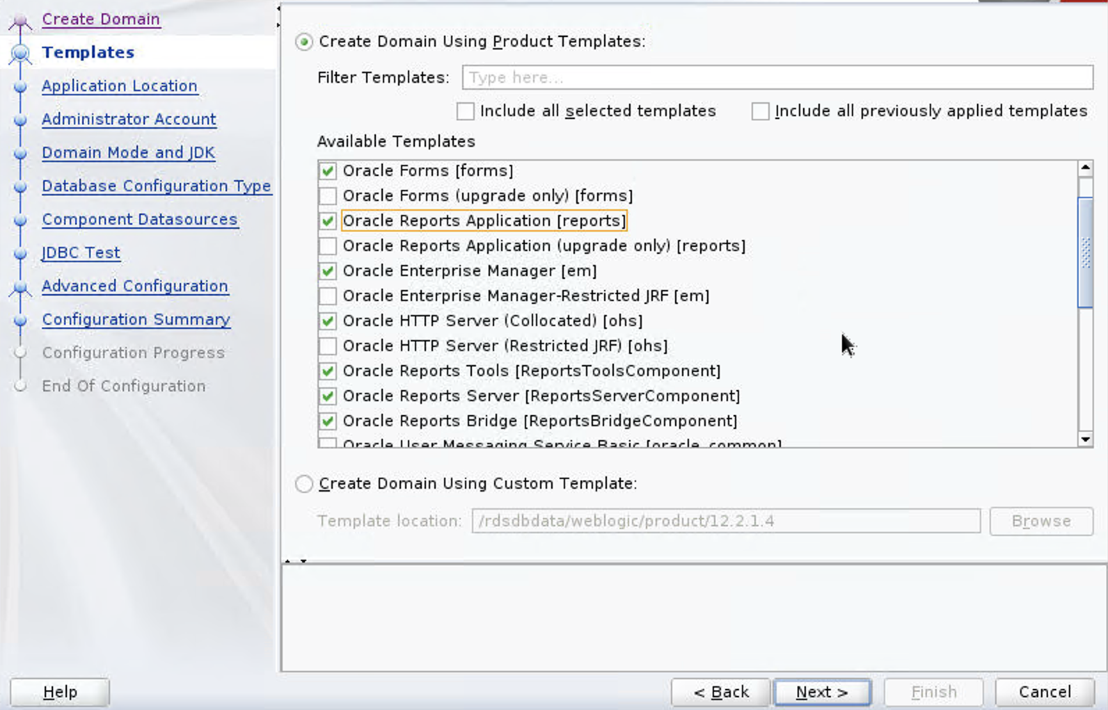- Select Create Domain using Product Templates and select the following templates: