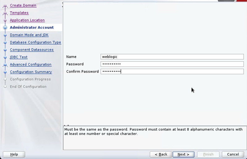 /rdsdbdata/weblogic/product/12.2.1.4/user_projects/applications/base_domain. - On the Administrator Account page, enter your WebLogic domain administration user name and password, then choose Next.