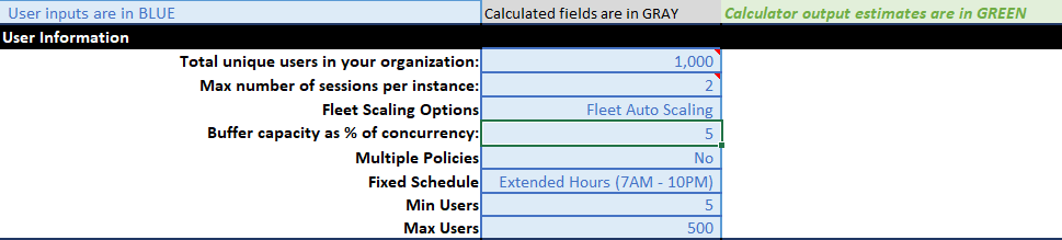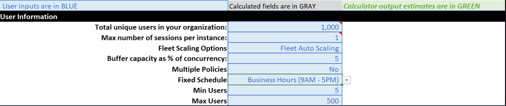 This Excel-based tool helps analyze usage patterns, determine appropriate fleet capacities, and suggest effective scaling policies for both single-session and multi-session fleets. It simplifies capacity planning while maintaining efficient resource use and seamless access.