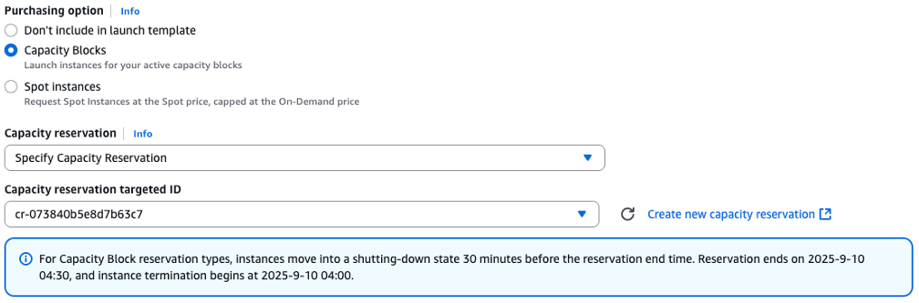 Under Advanced Details, change your purchasing option to Capacity Blocks and under Capacity Reservation, select Specify Capacity Reservation. Select your Reservation ID. Exclude the rest of the details from the Launch Template. This is the last step required to activate Capacity Blocks.
