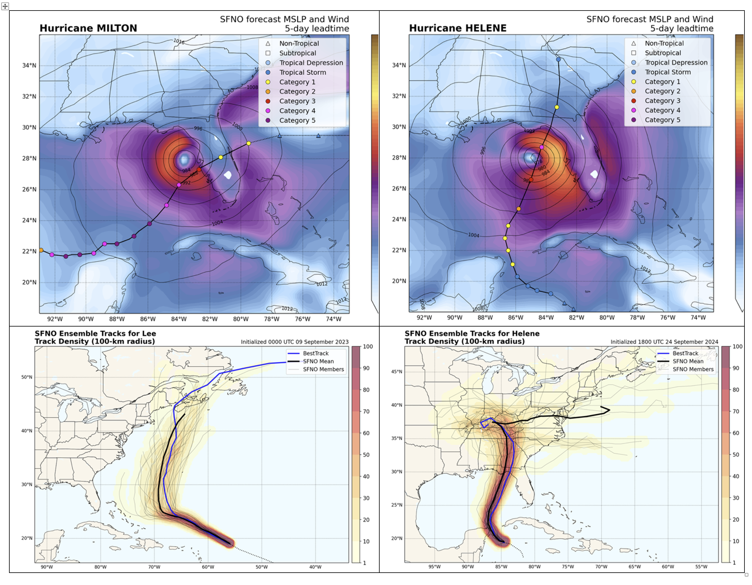To validate system performance, DTN constructed rigorous test cases around significant historical weather events, including Hurricanes Milton and Helene, and Storm Eowyn in the North Atlantic. In Figure 3 we show hurricane tracks for Milton and Helene. We also include the ensemble tracks for hurricane Lee and Helene, demonstrating the value in ensemble forecasts using a globally trained model. The results are all inference-based on the trained model, initialized with a collection of initial conditions to provide the ensemble forecasts.