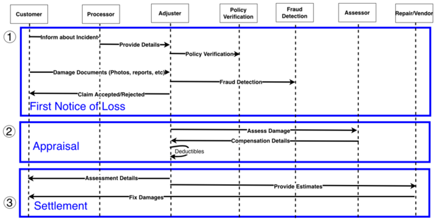 Figure 1 illustrates the First Notice of Loss (FNOL) process flow, showing how claims move through initial notification, assessment, and processing stages.