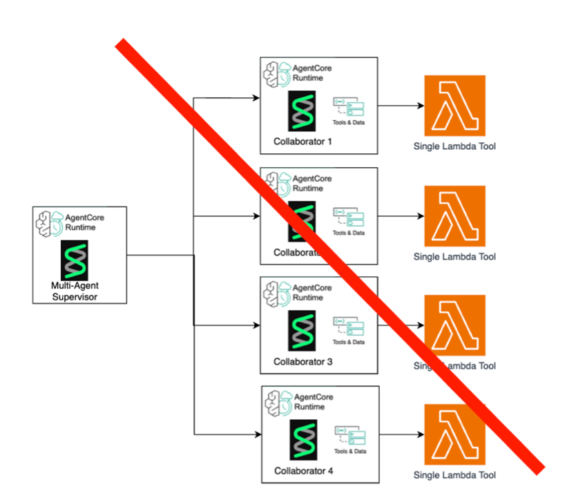 One observed example of agent washing is using an agent to host a single Lambda function, or a single tool, and adding a multi-agent supervisor just to create the illusion of using a multi-agent system, without really using agentic capabilities. This multi-agent supervisor would be more appropriate and effective when used for dynamic tool selection, orchestration, agency to explore different solution trajectories, and agent collaboration with data sharing.