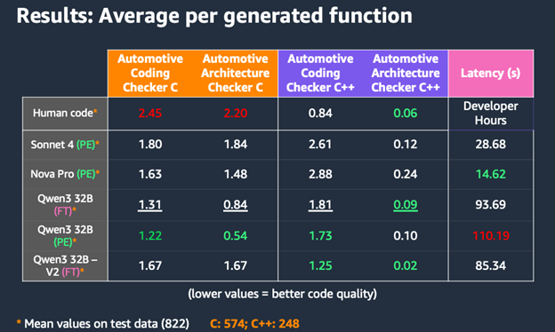 The results reveal interesting patterns: while PE-focused models like Qwen3 32B (PE) achieved strong C code quality scores showing 1.22 violations on average in Automotive Architecture, and 0.54 in Automotive Coding Checker rule set adherence, the FT-enhanced versions showed competitive results in C++ generation. Notably, Qwen3 32B – V2 (FT) achieved excellent Automotive Architecture Checker rule set C++ compliance (0.02) and solid Automotive Coding Checker rule set C++ scores (1.25), demonstrating the advantages of combining fine-tuning with prompt engineering.