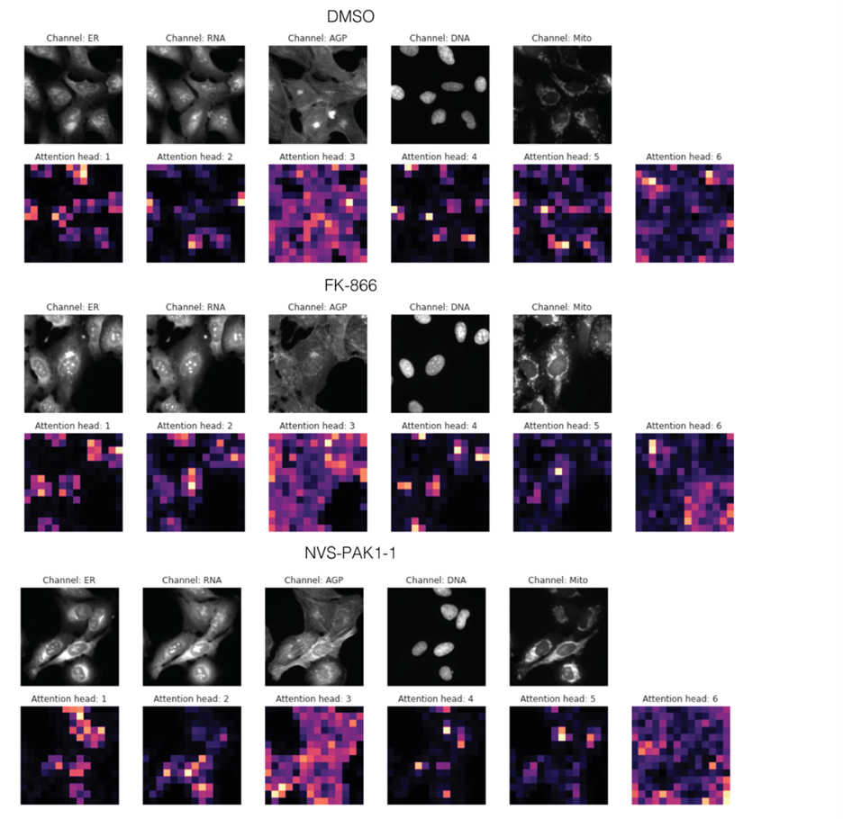 Figure 1: DINO self-attention maps. Cell Painting image crops and self-attention maps of the DINO attention heads in the last layer. Example images for DMSO, FK-866 and NVS-PAK1-1. The color scale in the self-attention maps represents the level of attention from the DINO [CLS] token, with lighter areas indicating higher attention. DINO was trained on the multisource data with the ViT-S architecture. This image is courtesy of Scientific Reports and Bayer AG.