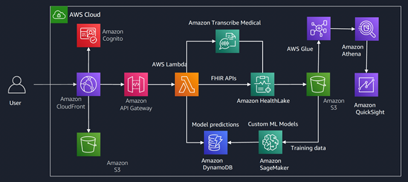 The Health Data Insights demo application architecture defines a standard web-serving tier utilizing Amazon CloudFront and Amazon API Gateway. These edge services, which provide low-latency access through caching and geo-proximity, communicate with the HealthLake and Amazon Transcribe Medical services running in an AWS region. Amazon Lambda, a service providing “serverless” code execution is used to implement microservices that orchestrate the calls to HealthLake and Amazon Transcribe. Enriched data in HealthLake can be periodically exported to Amazon S3 which can be optionally used to train custom health prediction models using Amazon SageMaker. From these models, SageMaker batch transform is used to make the custom model predictions, which are made available to the application via Amazon DynamoDB, a flexible and scalable NoSQL database.