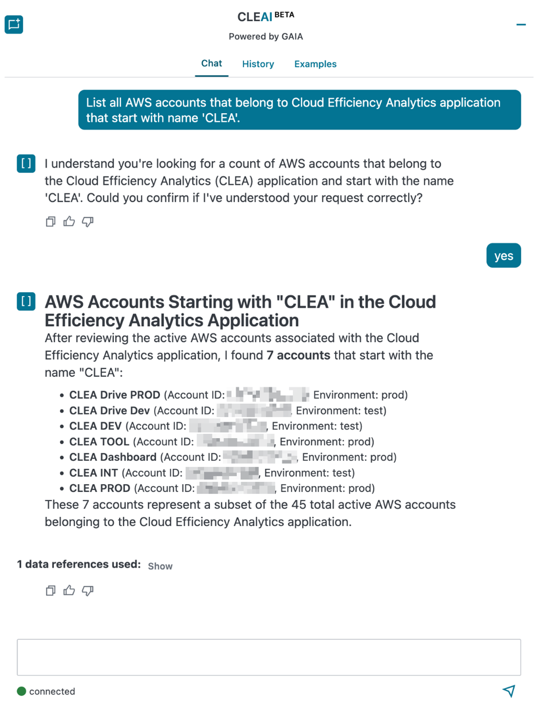 When a cloud application spans multiple cloud accounts or development environments, understanding its holistic cost requires accurately identifying all relevant application environments. For instance, a user can ask CLEAI to “List all AWS accounts that belong to Cloud Efficiency Analytics application that start with name ‘CLEA’,” and the assistant intelligently identifies and presents the relevant accounts.