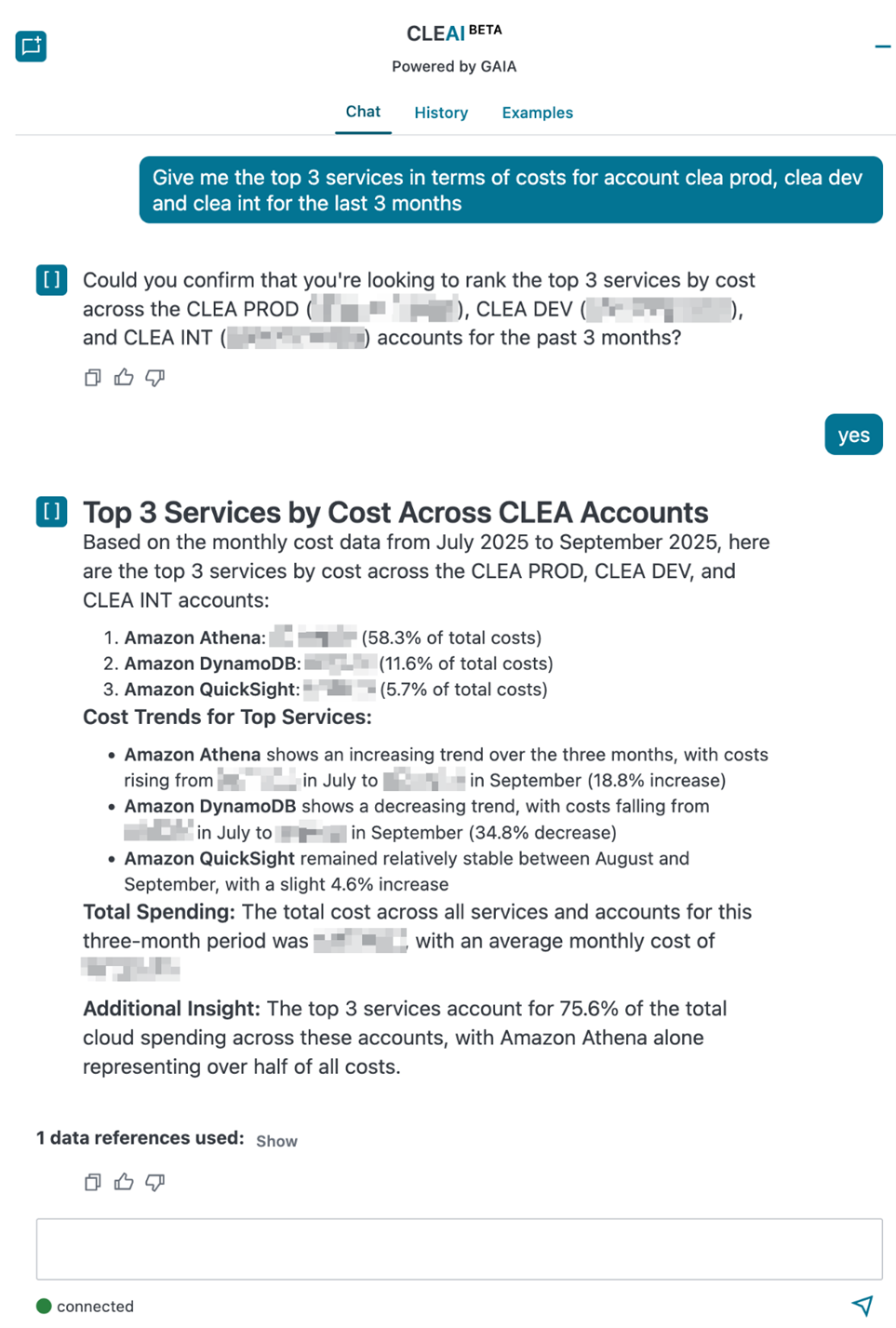 One of the major FinOps use cases is identifying which services are driving up cloud consumption costs. With CLEAI, a user can simply ask, “Give me the top 3 services in terms of cost for account clea prod, clea dev and clea int for the last 3 months per environment.” CLEAI then retrieves and processes data from multiple accounts related to the application, providing a clear breakdown of high-cost services for each environment. The system leverages CLEA’s APIs (discussed in the technical deep dive section) to access this information, while maintaining access controls based on the user’s permissions, ensuring data security and compliance.