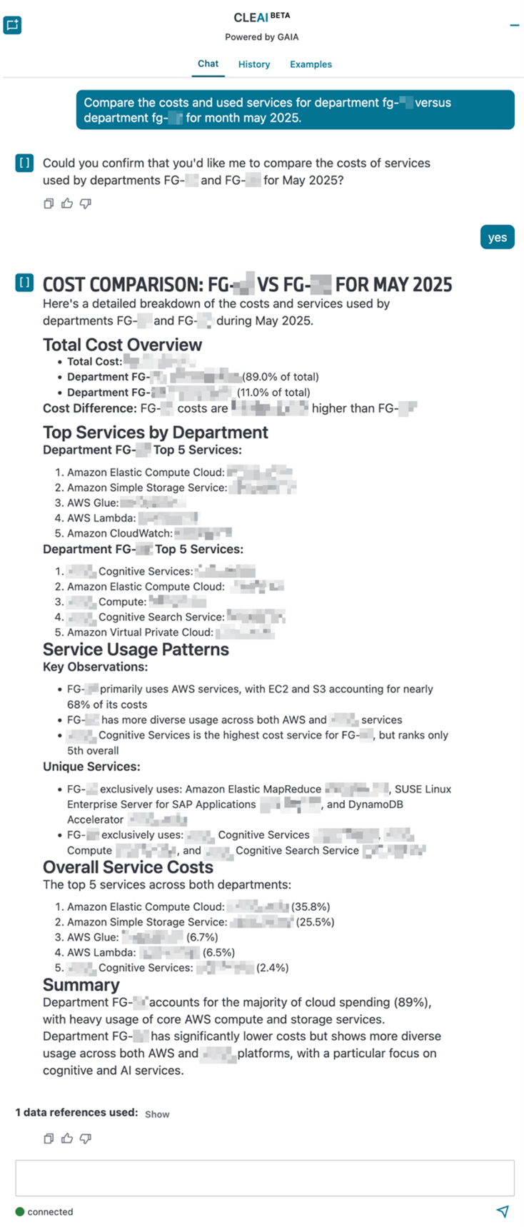 For central FinOps teams, CLEAI facilitates robust comparative spend analysis across various organizational units, applications, and cloud environments over custom time periods. The below example shows CLEAI responding to “Compare the costs and used services for department fg-xx versus department fg-yy for month may 2025,” providing a comprehensive breakdown that highlights differences in service usage and potential optimization opportunities.