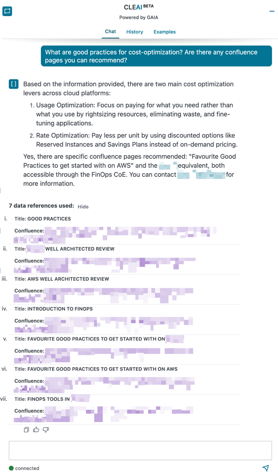 Beyond analysis, CLEAI actively guides users toward optimizing their cloud infrastructure. It provides actionable recommendations based on a rich knowledge base that combines official AWS and other cloud providers’ technical documentation. Additionally, BMW Group’s proprietary FinOps knowledge base provides guidelines and best practices related to operating cloud services, including resource usage optimization strategies, budget management, and reporting standards tailored to BMW Group’s financial operations in cloud environments.
