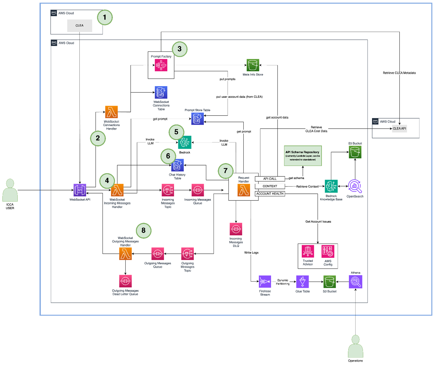 The architecture for CLEAI use case expands the developments made within BMW’s In-Console Cloud Assistant (ICCA). The diagram below shows the latest version of ICCA’s architecture, which has been modified to support FinOps use cases. The following diagram demonstrates the core components of the backend architecture featuring the execution of multiple LLM chains.