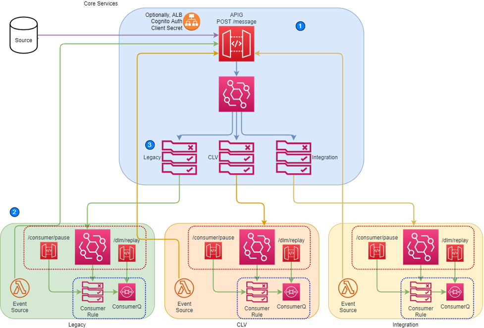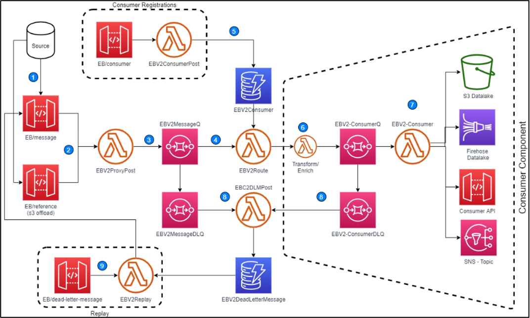 - A routing AWS Lambda function picks up the message and determines the routing from a consumer Amazon DynamoDB table.