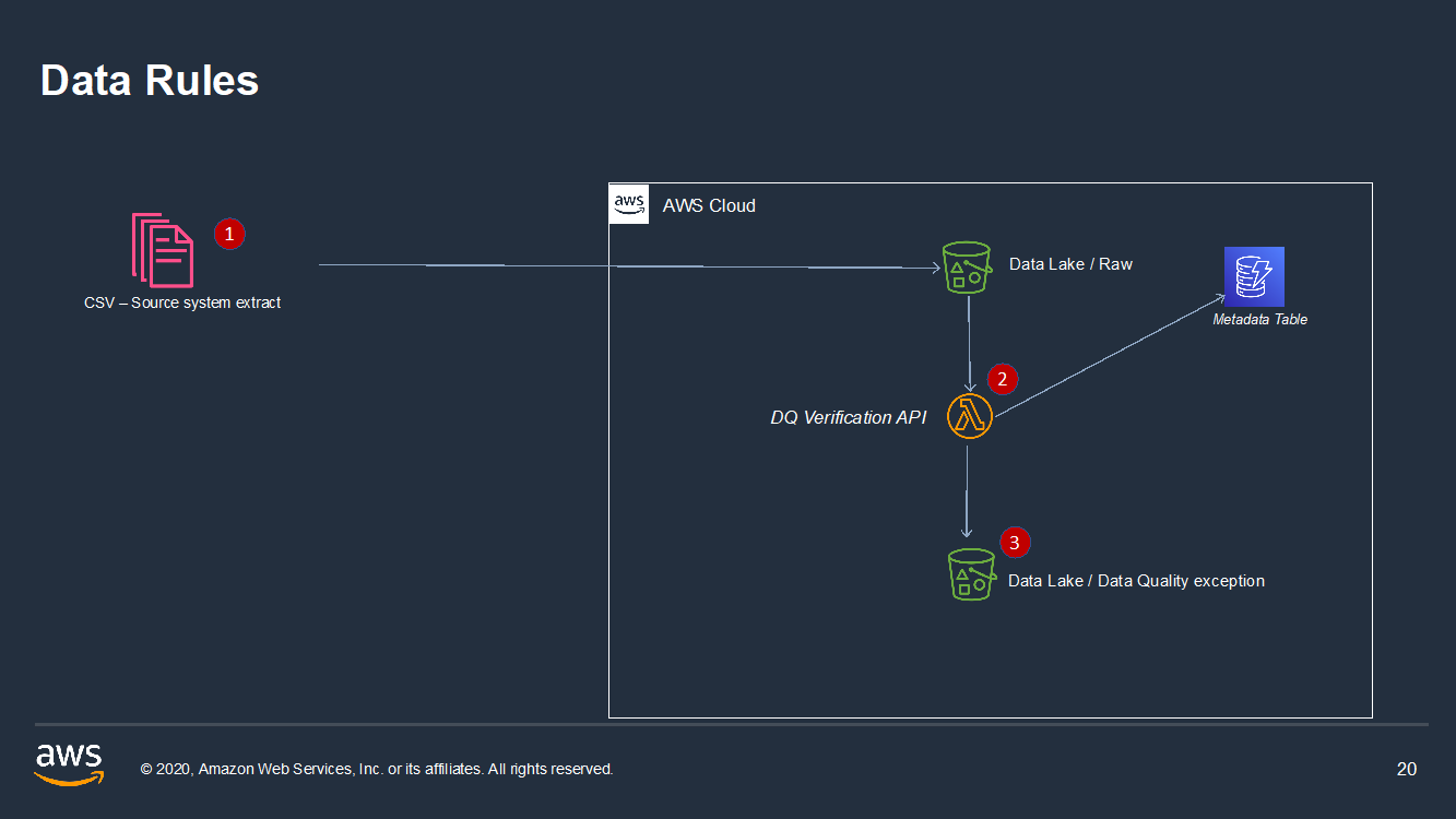 - The data quality verification AWS Lambda function is invoked to perform the quality checks. This AWS Lambda function extracts the rules from the metadata services repository.