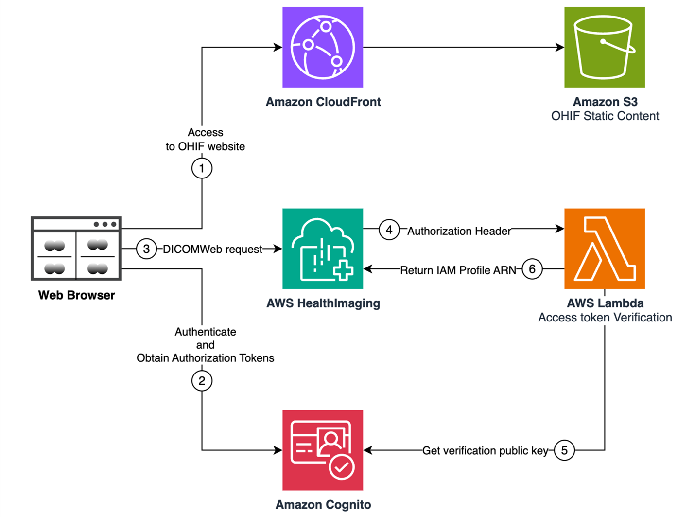 - Amazon CloudFront: Serves the OHIF Viewer as a static website hosted on Amazon S3.
