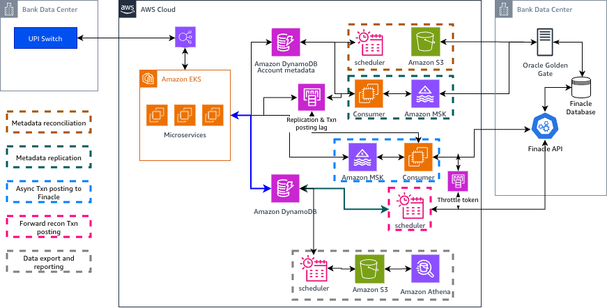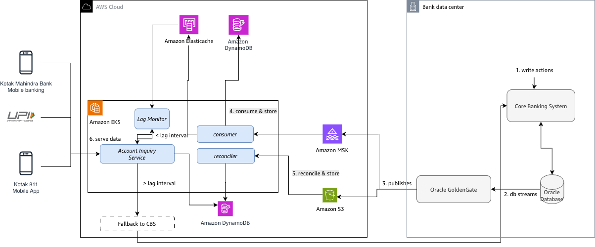 - Account metadata is replicated from Finacle to DynamoDB using Oracle GoldenGate, Amazon MSK, and Kafka consumers.