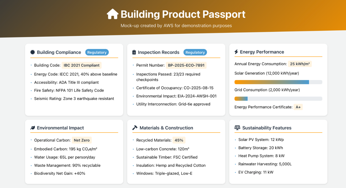 While regulatory compliance is one aspect, especially in the EU, it is not the only reason why customers across industries making physical goods are considering DPP implementations, sometimes using different terms like Digital Material Passports (DMPs). According to research commissioned by Amazon and conducted by Oxera, DPPs have the potential to transform product information sharing, delivering cost efficiencies and new business opportunities. Chemical manufacturers are creating passport capabilities for materials to handle an increasing volume of transparency requests received from their customers in a scalable, future-proof manner. Approaches to operational data, like Digital Thread in manufacturing, aspire the enablement of analytics and AI use cases based on holistic collection and contextualization of product attributes along the entire value chain. Finally, transparency into sustainability attributes of products allows companies to compete not only on monetary cost, but on carbon footprint, while allowing the end customer to validate this directly.