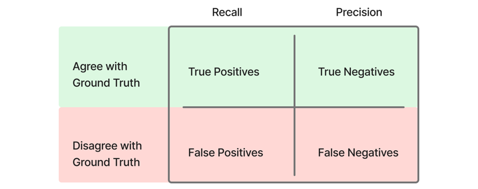In the data science community, the most standard way to measure accuracy is a metric called the F1 Score. The F1 score is a metric that averages precision and recall, which are the two key aspects of model performance, against the ground truth.