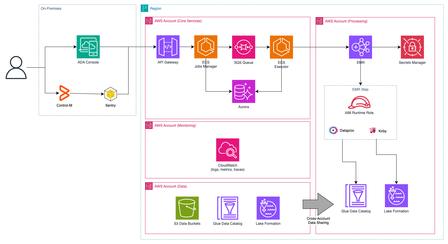 Access management for data lake resources is handled through AWS Lake Formation, aligning with BBVA’s organizational structure. To simplify managing permissions across many units and tables, BBVA implements LF-Tags for categorizing data lake objects and assigning permissions to principals. This approach is automated through the ADA console for efficient management at scale. This data access workflow is described in more detail in part 4 of this blog post series.
