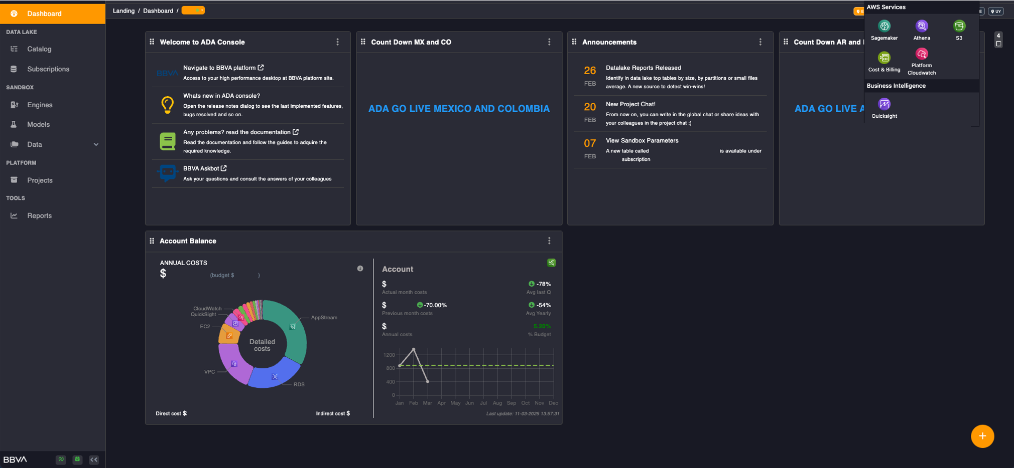 All roles interact through the console of the BBVA Global Data Platform, named ADA (Analytics, Data, AI), which serves as a centralized control interface. Through this console, users can manage engines, execute and monitor jobs, generate reports, and control account spending. This unified interface ensures consistent security policy enforcement while providing users with the tools they need to perform their tasks effectively.