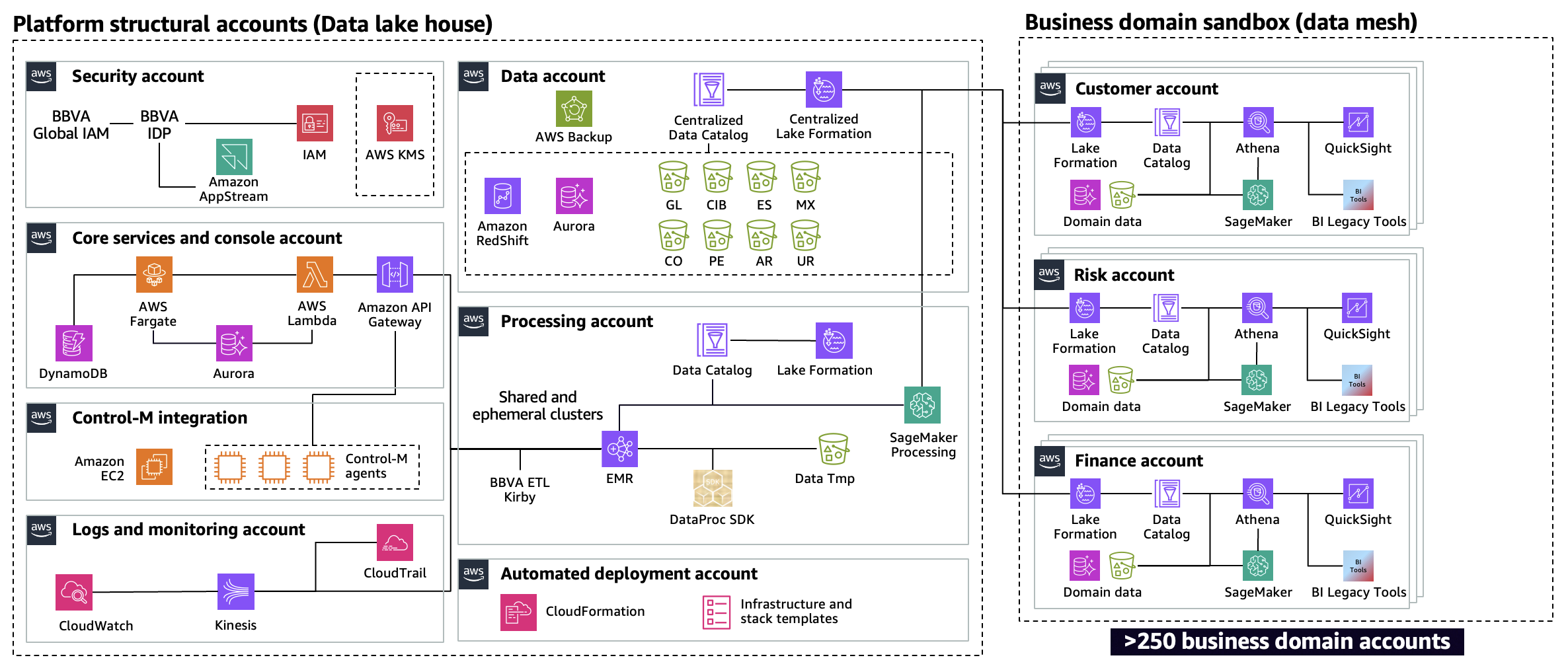 The mappings of accounts, roles, and employees is handled internally through BBVA’s identity management systems. - AWS Key Management Service (KMS) encrypts all data at rest in AWS accounts. Additionally, AWS Glue Data Catalog and Amazon Simple Storage Service (Amazon S3) buckets are protected with restrictive resource policies to prevent unauthorized access.
