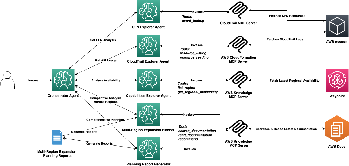 Building production-ready AI agents for Regional expansion planning requires a systematic approach that combines infrastructure intelligence using deep research on Regional availability with automated guidance to help decision-making. We demonstrate how to combine the AWS Knowledge MCP server along with the AWS CloudFormation MCP and CloudTrail MCP servers to perform deep research with AI agents to automate Regional expansion planning.