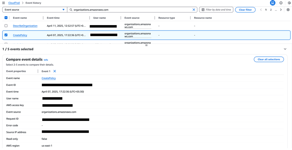 - CloudTrail event logging: When SCPs are created or modified, AWS CloudTrail automatically captures these changes in detailed event logs, which can be viewed in the AWS Management Console for CloudTrail, as shown in the following screenshot. These logs serve as a comprehensive record, containing both the policy content and essential metadata that will be used for context generation later in the workflow.