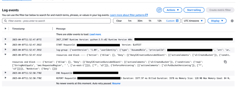 - Lambda extraction: The extractor Lambda function processes incoming events to isolate and extract critical policy content and requirements. This processed information is then stored in Amazon S3, establishing a reliable and accessible data source for context generation. It can be accessed using the Amazon CloudWatch console, as shown in the following screenshot.
